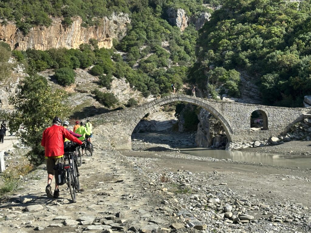 Cycling through forests and meadows, we arrive in Leskovik. From here, a long descent takes us to the Vjosa River, with views of Greek mountains and villages. Along the way, we pass the stunning view where the Nemercka Mountain range meets the Vjosa River. After reaching Petran village, you have the option for a short ride to the Benje thermal springs, where you can swim in the locally-built pools and walk over an Ottoman bridge. Afterward, we cycle to Permet, known for its traditional food and “gliko” sweets. Our driver will then transfer you to Gjirokaster (approx. 45 min), a UNESCO town defined by its castle, stone streets, and traditional stone houses. We explore the castle, enjoy panoramic views, and learn about the town’s history before visiting an example of Gjirokastra architecture. In the afternoon, explore the Old Baazar.